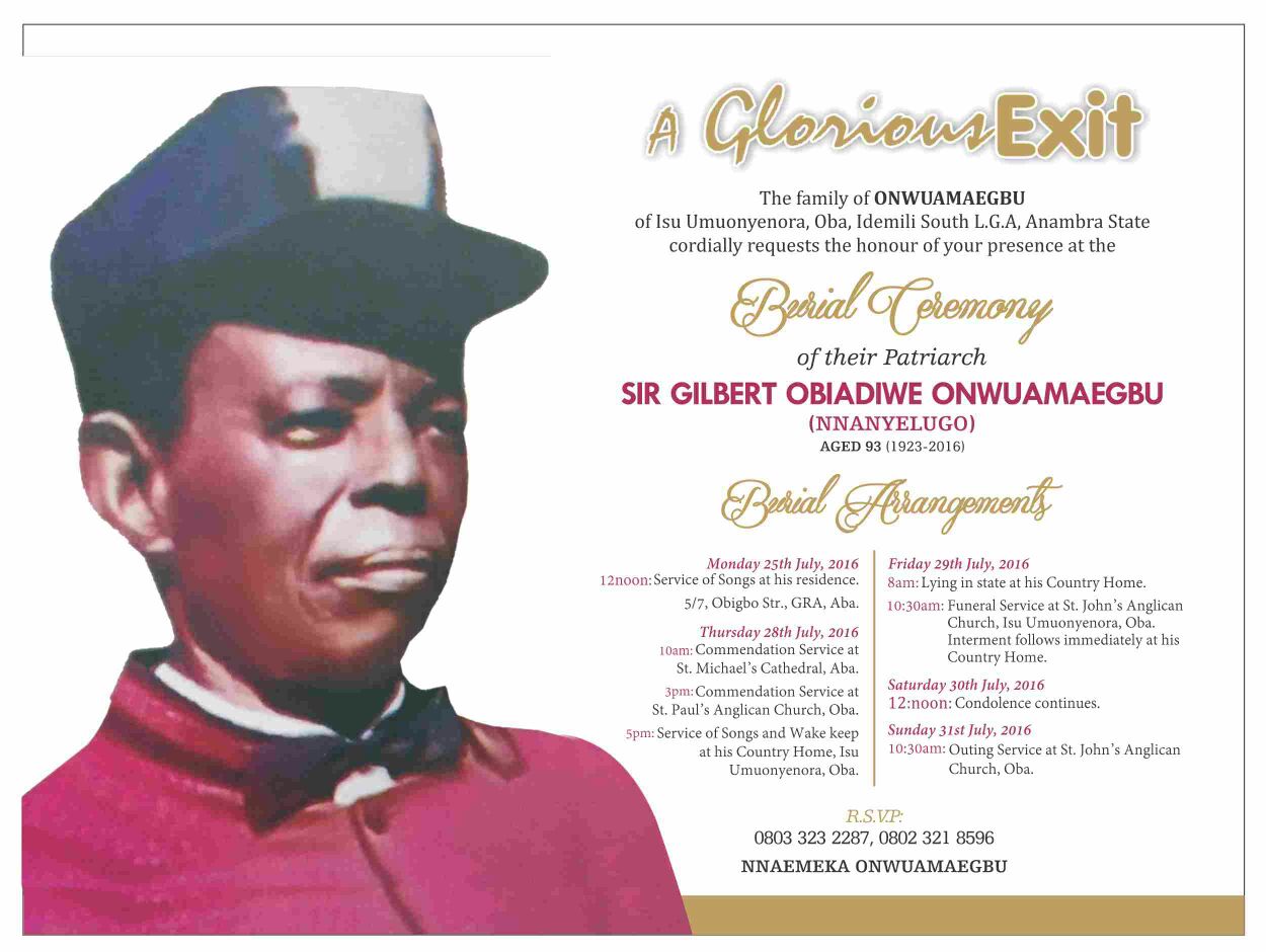 On July 29th, all roads lead to Isu-Umuonyenora Village of Oba Town in Idemili South LGA, Anambra State for the burial of Sir Gilbert Obiadiwe Onwuamaegbu. Late Sir Onwuamaegbu was the father in-law to the distinguished Senator Annie Okonkwo. He passed on to the glory on the 18th …